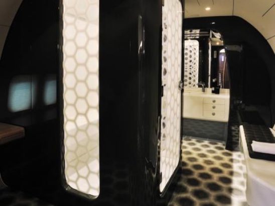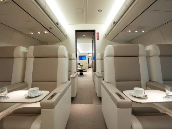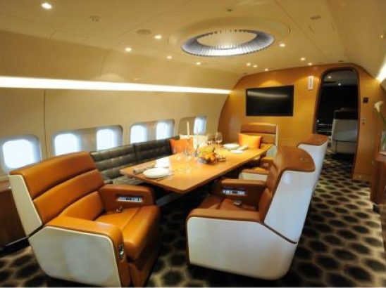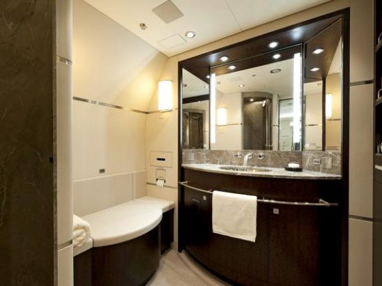 The interior was designed by a famous Marc Newson who created a clean modern futuristic look. Interior completion and outfitting was made at Lufthansa Technik in Hamburg with no expenses spared. Interior materials include fabric, silk carpet, leather side boards, composites and real wood laminate.