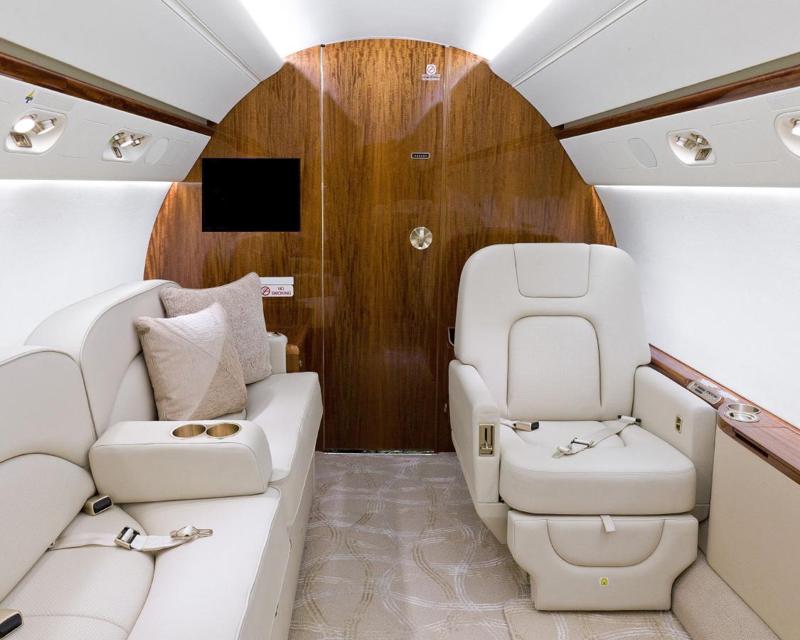 The cabin interior was completed with Enhanced Soundproofing and features a high gloss Qtr Fig Andiroba wood cabinetry complimented by polished satin almond gold colored plating and neutral patterned carpeting throughout the cabin. FAA compliant and EASA capable with prior EU registration.