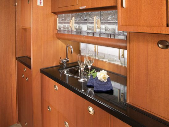 The cabin interior was completed with Enhanced Soundproofing and features a high gloss medium brown wood cabinetry complimented by polished satin coloured plating and attractive carpeting throughout the cabin.