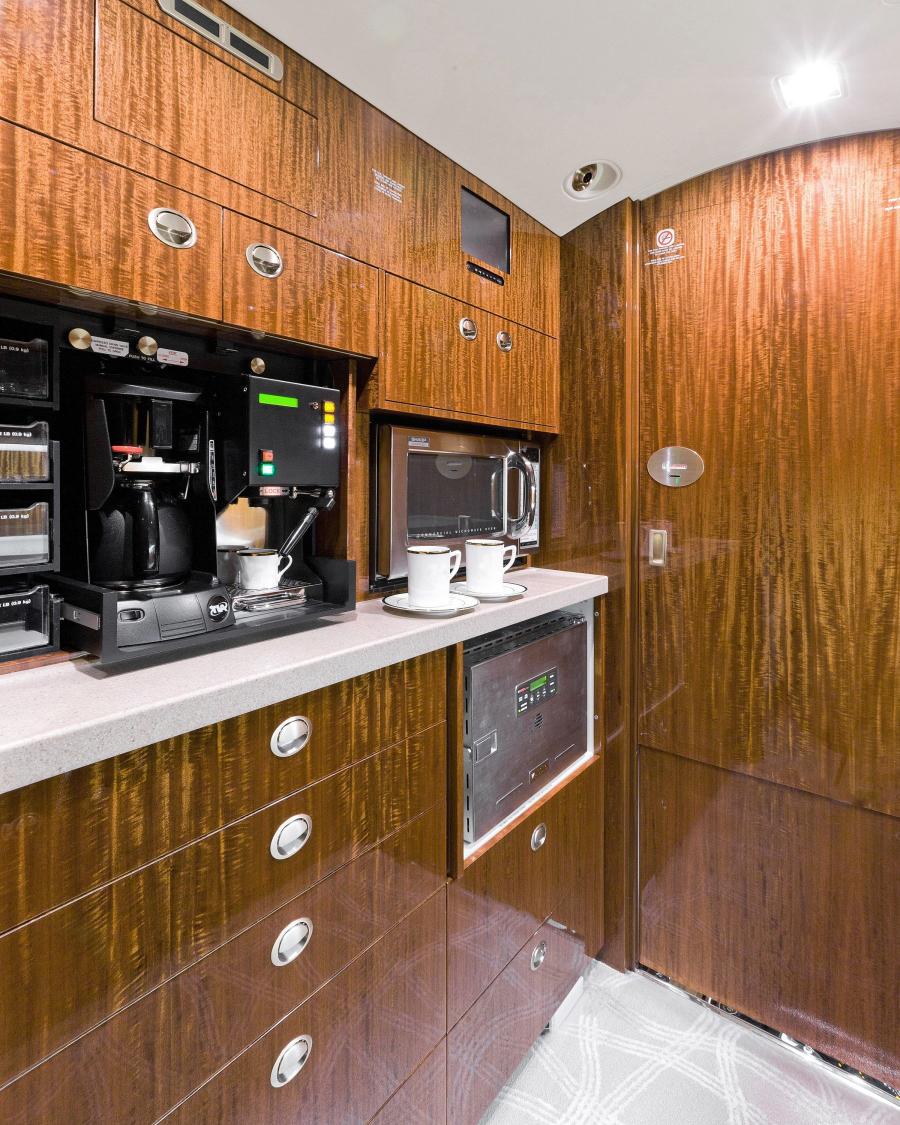 All seating surfaces are covered in Aeristo leather. The fully equipped forward galley offers numerous amenities including gasper cooled storage, both high temp and microwave Ovens as well as a TIA Coffee Maker and Aerolux Espresso Maker.