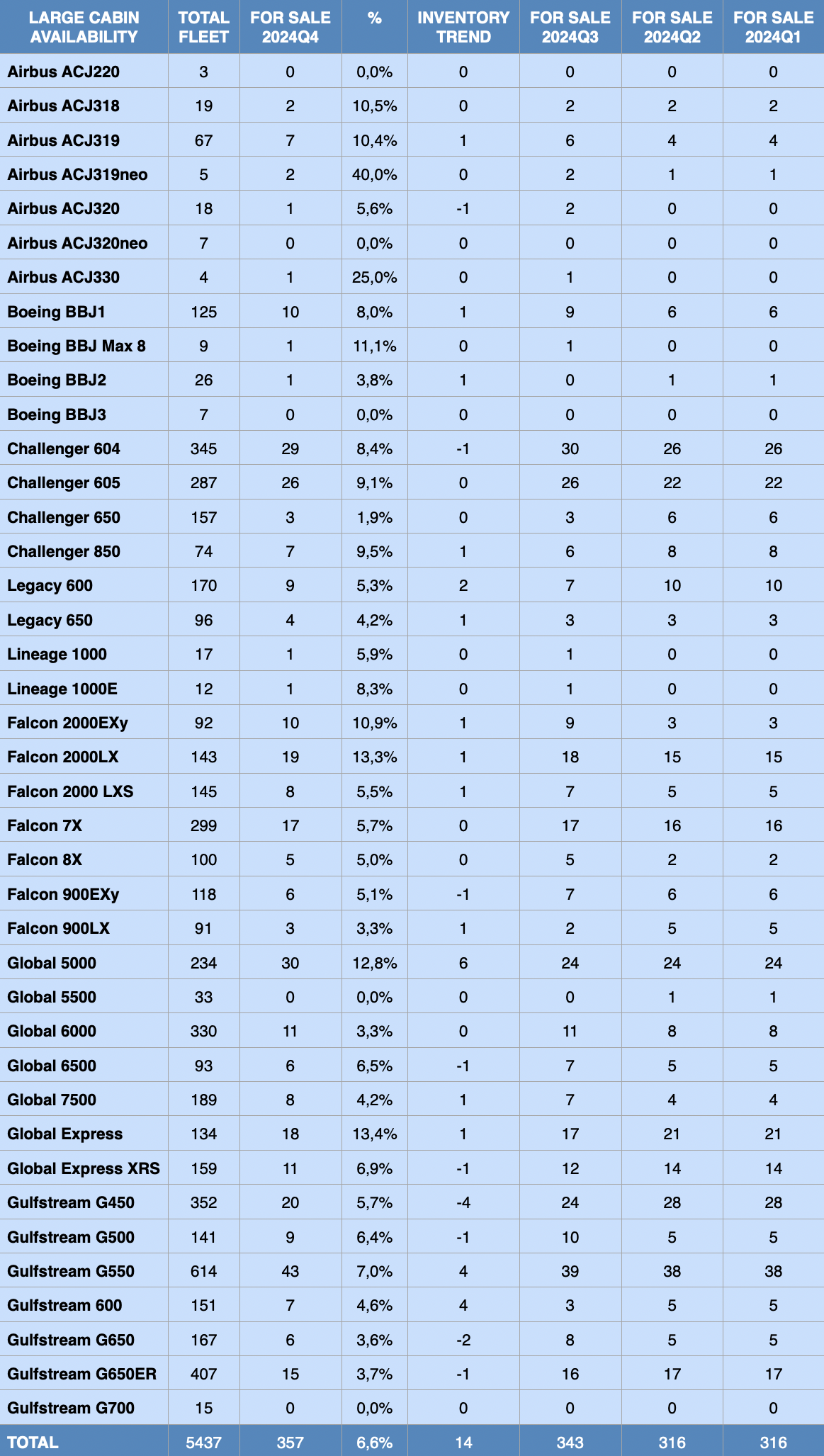 General large cabin available inventory level is at a low level compared to the past ten years. With continued strong demand for private flights and a shortage of late model planes paired with higher inflation rates, the values are expected to remain relatively stable. A market correction is however in the works with a turn from a seller’s market to a buyer’s market.
