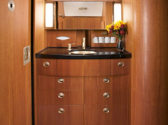 All seating surfaces are covered in Creme leather. The fully equipped forward galley offers numerous amenities including gasper cooled storage, both high temp and microwave Ovens as well as a TIA Coffee Maker and Aerolux Espresso Maker.